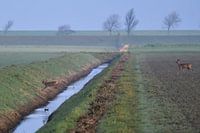 Reeën springen over een sloot in een polder in het Noorden van Nederland met op de achtergrond de dijk / Deer jumping over a canal in a polder in the North of the Netherlands with the dike in the background