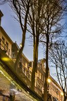 Een aantal gebouwen in Utrechts Nieuwe Gracht weerspiegeld in het water. Omdat deze foto is omgekeerd geeft dit een abstract en vervreemd effect.