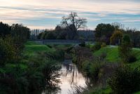Hier reflecteert een wintertafereel in de rivier de Demer, nabij Aarschot, Vlaanderen.