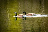 weerspiegeling 2 canadese ganzen zwemmen in meer de een achter de ander