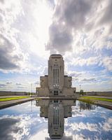 Strakke reflectie door kalm water aan het monumentale Radio Kootwijk. Een geweldig markant, architectonisch pand midden in de Veluwe. Na dagen storm eindelijk zon.