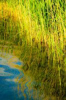Reflectie rietgras in het water aan de oever van een meer abstract