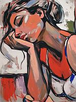 Reflectie | Silent Color Thoughts - Dit moderne portret schilderij toont een vrouw die in gedachten verzonken is, haar hoofd rustend op haar arm, met expressieve, brede penseelstreken en een levendig kleurpalet waaronder rood en wit.