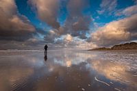 Regenbuien trekken over de ruige zee, een man staat eenzaam op het strand! In gezelschap van zijn reflectie. Een lange sluitertijd opnamen legt de beweging van het water mooi vast.