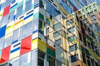 Reflectie kleurrijke gevel hotelgebouw in de mediahaven Düsseldorf Rijn Duitsland