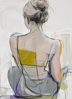 expressieve en subtiele interpretatie van een vrouwelijk figuur, gezien van achteren. De losse, vrije penseelstreken creëren een dynamische compositie waarin de vormen van haar rug, schouders en elegant opgestoken haar centraal staan. Het werk maakt gebruik van een harmonieus kleurenpalet, met neutrale tinten zoals grijs, beige en wit, aangevuld met levendige accenten van geel en oranje. Deze kleurcontrasten voegen energie toe aan de zachte, introspectieve sfeer.