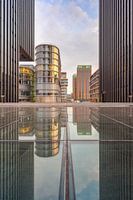 Reflectie in een glazen dak tussen het Hyatt Regency Hotel aan de linkerkant en een kantoorgebouw aan de rechterkant.