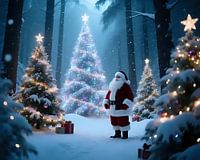 De Kerstman staat majestueus in het hart van een pittoresk, besneeuwd bos, omringd door de hoogste kerstbomen, hun groene takken zwaar met glinsterende sneeuw. Zijn felrode vacht steekt fel af tegen de glanzend witte achtergrond, terwijl de witte bontrand op zijn tent en hoed op verse sneeuw lijkt. Zijn vrolijke, sprankelende ogen…