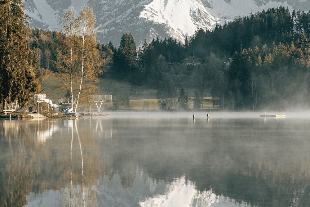 De Wilder Kaiser bergketen prijkt boven het bos uit en wordt door het water van de Schwarzsee gereflecteerd in de warme ochtendzon.