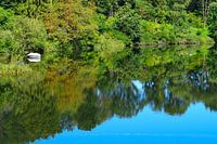 Reflectie in perfecte spiegel water van groene natuur, wit bootje en strakblauwe lucht