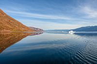 Wanneer je door de Scoresby Sound vaart kijk je je ogen uit. Bij windstilte krijg je de meest mooie reflecties, hier met de rimpeling veroorzaakt door een zuchtje wind, in de verte zie je ijsbergen en ijsvorming op het water door de aanhoudende kou.