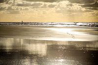 Vanaf de Noord-Hollandse kust over de Noordzee en het strand kijken. Gouden zonnestralen schijnen door de wolken op de zee. Reflectie op het natte zand. Het is laag water. Hargen aan Zee, Noord-Holland, Nederland