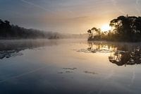 Bij de vennen tijdens een mooie zonsopkomst en een laaghangende mist, is er op het strakker water een mooie reflectie te zien van de lucht en bomen in het landschap.