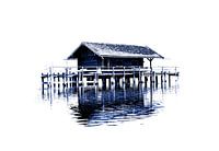 Een artistiek meesterwerk dat de harmonie tussen natuur en architectuur vastlegt. Deze foto toont een charmant houten huis op palen, rustig neergestreken boven een glad wateroppervlak. De weerspiegeling in het water versterkt de mystieke sfeer en trekt de kijker mee in een wereld van contemplatie. Het sobere kleurenpalet in diepblauwe…