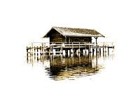 Een artistiek meesterwerk dat de harmonie tussen natuur en architectuur vastlegt. Deze foto toont een charmant houten huis op palen, rustig neergestreken boven een glad wateroppervlak. De weerspiegeling in het water versterkt de mystieke sfeer en trekt de kijker mee in een wereld van contemplatie. Het sobere kleurenpalet geeft het…