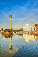 Reflectie televisietoren Gehry-gebouwen in de mediahaven in Düsseldorf aan de Rijn