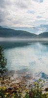 Reflectie van bergen, een gletsjer en groene naaldbomen in een blauw / turquoise kleurig meer in Noorwegen. Op de voorgrond zijn enkele kleurige bloemetjes.