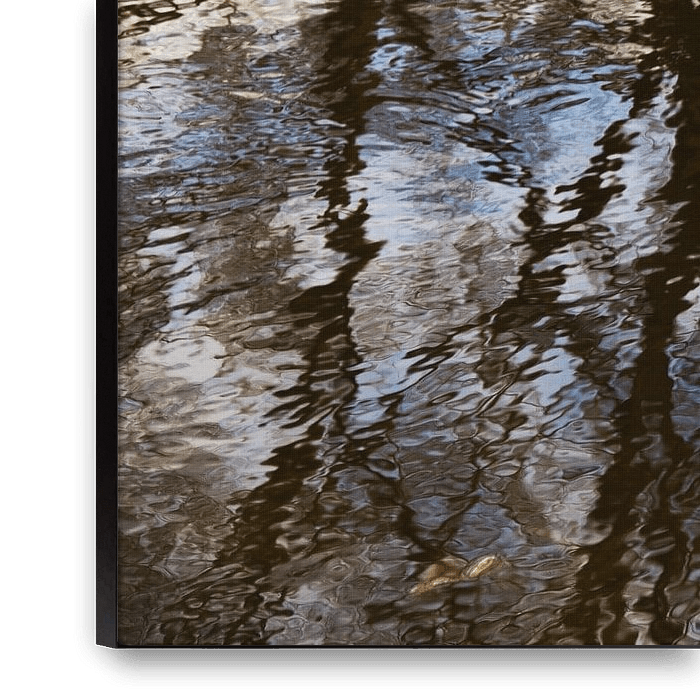 Een kleurenfoto van bomen die in het water reflecteren. Je ziet vaag en vervormd de takken en de blauwe lucht met wat bewolking. Het lijkt een heel andere wereld en het beeld is bijna abstract.