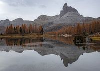 Alhoewel het een bewolkte ochtend was, toch een mooie kalme foto van de reflectie van de bergen in het meer. Foto genomen in de bergen van de dolomieten.