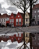 Reflectie in een plas regen van de historische panden in het centrum van Brugge, België