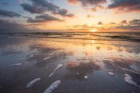 De ondergaande zon werpt een warme gloed over het strand bij Zandvoort. De laatste lichtstralen reflecteren prachtig in het natte zand, waar schuimende golfjes zich langzaam terugtrekken in zee. Wolkenluchten in zachte tinten van oranje, roze en blauw zorgen voor een dromerige sfeer en brengen rust in het beeld. De lage hoek van de foto…