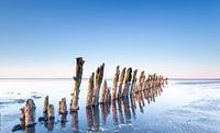 Rij palen tijdens zonsondergang gefotografeerd op het wad vlakbij Moddergat Friesland