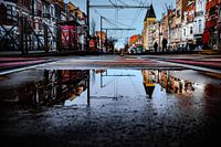 De plas water gaf me het idee voor een reflectie te maken van het bepaald gedeelte van de stad.