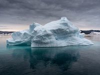 Den brok ijs afgebroken van de grotere ijsbergen in de baai van Discobay, bij Illulisat in Groenland. Het was een bewolkte nacht bij deze foto.