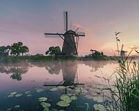 Kinderdijk heeft prachtige molens. Tijdens zonsopkomst en windstil is het er bijna magisch. De ochtend mist is nog mooi te zien over het water met een mooie roze kleur nog in de lucht.