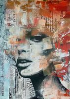 Boeiend portret verrijkt met diverse gemengde media elementen, waaronder krantenknipsels, verfspatten en abstracte vormen. De centrale figuur, een vrouwengezicht, is krachtig weergegeven in zwart-wit, wat direct de aandacht trekt. De lippen en ogen van de figuur zijn bijzonder expressief, waardoor een gevoel van diepe emotie of reflectie wordt overgebracht.