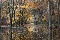 Kleurrijk herfstbos gereflecteerd in ondergelopen deel van het Leuvenumse bos. De leuvenumsebeek of Hierdensebeek overstroomt in natte delen van het jaar. Het ondergelopen land zorgt voor prachtige reflecties van de herfstkleuren.
