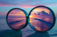 Stel je een vredige zonsondergang voor waar de hemel in vurige tinten oplicht en de serene zee het licht van de laatste zonnestralen weerspiegelt. Dit unieke perspectief, vastgelegd door een stijlvolle ronde bril, versterkt de schoonheid van dit dagelijkse wonder met een kleurenpalet dat varieert van zachte blauwtinten tot warme oranje…