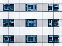 In de ramen zie je de spiegeling van het gebouw aan de overkant van de straat.