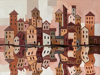 Huizen weerspiegeld in water.