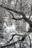 Een oude verweerde boom die zichzelf reflecteerd in het water. In zwart wit gefotografeerd. Wil je eens een andere visie? Dan kan deze plaat ook eens ondersteboven worden gehangen.