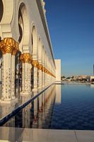 Reflectie van de rijk gedecoreerde zuilengang van de Sheik Zayed Grand Mosque