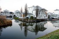 Amerikaanse woningen in wijk De Groote Wielen te Rosmalen. Watertuinen. Prachtige reflectie op het water.