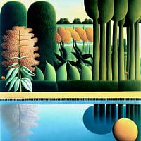 Een surrealistisch tafereel toont een zwembad als een poort naar een andere wereld. De reflecties op het wateroppervlak creëren een betoverend schouwspel, waarin de grenzen tussen realiteit en verbeelding vervagen. Bekende vormen worden vreemd en omgekeerd, waardoor de kijker wordt uitgenodigd om een ontdekkingsreis te maken door een wonderbaarlijke droomwereld vol mysterie en verwondering.