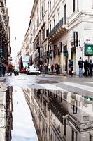 Prachtige weerspiegeling van de gebouwen in deze winkelstraat in het centrum van Rome. Een typisch Italiaans straatbeeld in Rome.