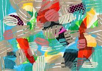 Abstract kunstwerk. Schilderij in combinatie met collage technieken. Inspiratie: gedachten die passeren als losse flarden. Structuur met veel lagen, kleuren en textuur.
