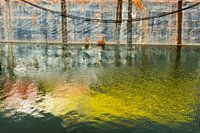 Weerspiegelingen in de Waalhaven in Rotterdam. De reflectie van felgekleurde kranen en een roestig ponton in het water van de haven geeft een prachtig, bijna abstract beeld.