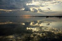 Zonsopkomst met zonestralen die door de wolken schijnen boven spiegelend wateroppervlak in Ras al Hadd te Oman