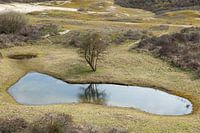 Wat een idyllisch plaatsje. Een mooi boom die reflecteert in een vijvertje te midden van natuurpark in het Zwin
