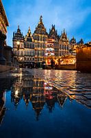 Een bezoek aan de kerstmarkt van Antwerpen op een regenachtige dag kan nog steeds mooie resultaten opleveren. Ik heb hier een kletsnatte stoep gebruikt om de reflecties van de prachtige gebouwen aan de Grote Markt van Antwerpen vast te leggen.