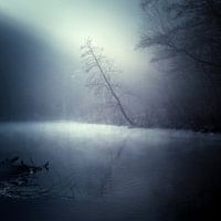 In een kalm en mistig rivierlandschap wordt een schuin staande boom weerspiegeld in het stille water. Dim licht filtert door de mist en creëert een mysterieuze en etherische sfeer. Het tafereel roept een vredige maar griezelige sfeer op en combineert de elegantie van de natuur met verstilling.