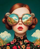 Een stijlvolle vrouw met een bloemenpatroon en een retro zonnebril laat de betoverende natuur in haar reflecties tot leven komen, wat de verbeelding prikkelt en een gevoel van nostalgie oproept.