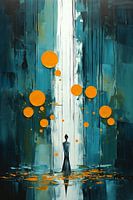 Dit schilderij schept een wereld waarin kleuren en stilte elkaar ontmoeten. Tegen een diep turquoise groene achtergrond vormt zich een canvas van betovering.