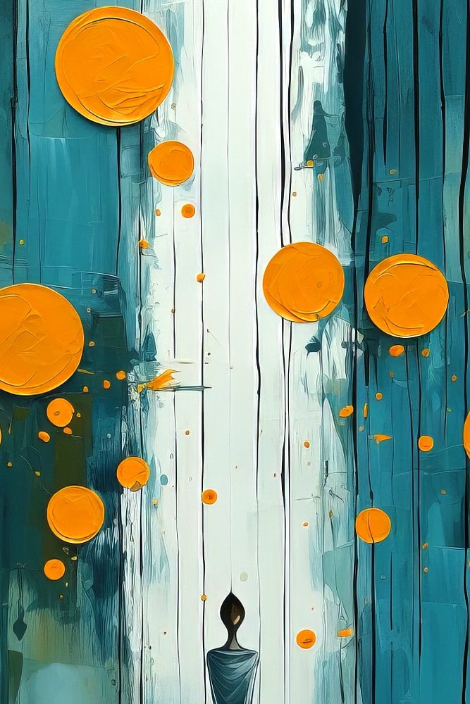 Een verticale lichtbaan snijdt het midden door, als een poort naar een andere realiteit. Ondersteboven lijkt het als een stille wateroppervlakte waarboven een schilderachtige hemel zweeft. Donkergele en oranje cirkels sieren de lucht als mystieke planeten in een serene dans.