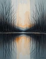 Reflections of Serenity" vangt de stille schoonheid van een winterlandschap. Kale bomen staan gespiegeld in het stille water en weerspiegelen het zachte licht van dageraad of schemering. Dit werk roept een gevoel van vrede en rust op.