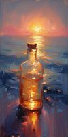 Een glazen fles vangt de laatste glinsterende stralen van de zon die in de zee zakt. De reflecties dansen over de golven en geven de fles een gloeiende kern, die bijna licht lijkt te geven in het vallende duister.